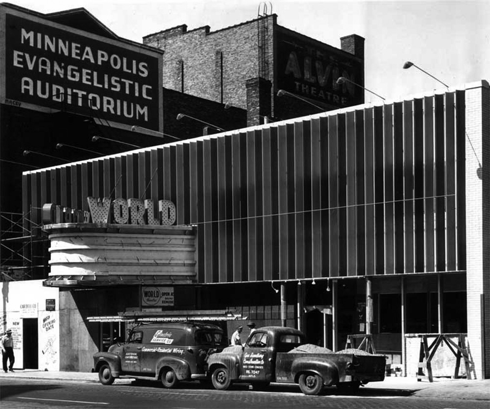 “Show Houses: Twin Cities Style” by Kirk Besse, says the World opened as the Garden in 1915. I can’t find any ads for the Garden in the newspapers of the day, but I’ll take his word for it. It closed in ‘32, was renovated in ‘49, and was gutted & rebuilt in 1955. This picture dates from July of that year.