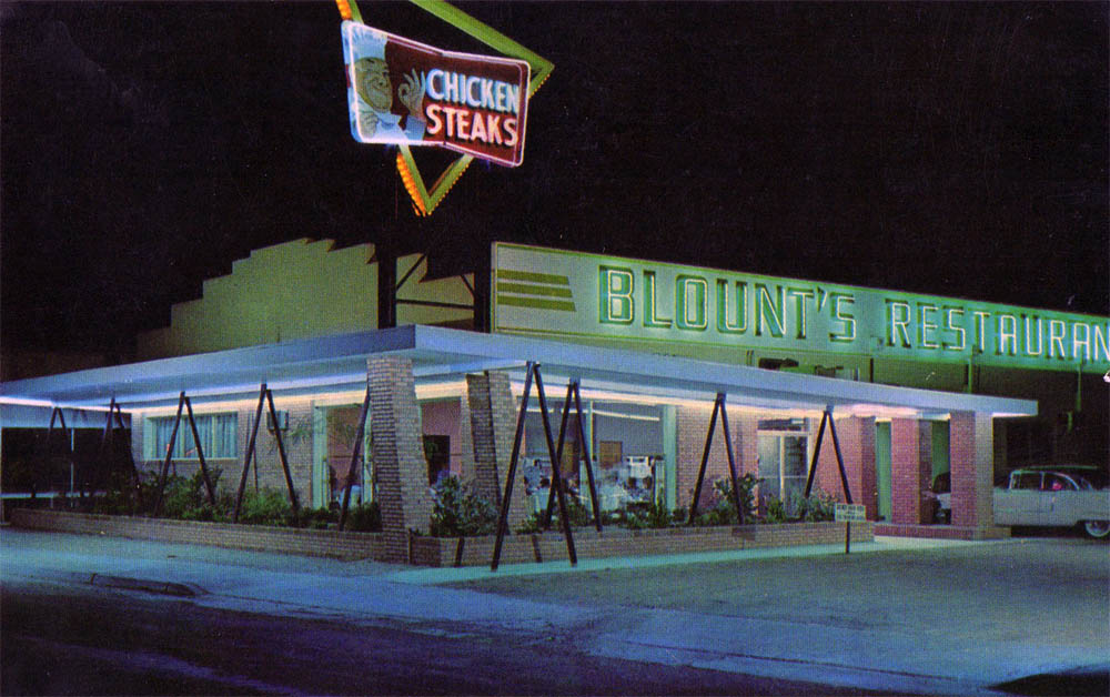 This night view was probably intended to highlight the upgrades. It has a modern look, but look at the bones of the place: old. Twenties or before. They added the brick pillars, leaning into the wind of the future, and the pipes lifted from a rocket gantry.