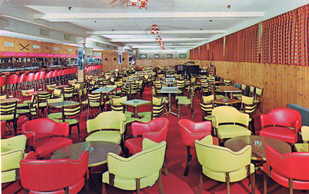 I’m sure they served food here, but the size of tables indicates this was a place for drinking. Knotty pine walls! Looks bright enough, but that wasn't enough to bring in the young'uns. Alas: