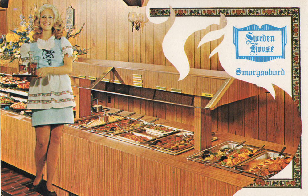 The Sweden House chain, lovingly remembered by its patrons here, started in Elgin IL in 1958 (or so; this 1967 article says it was founded nine years ago.) They expanded into Florida, put up some more in Illinois, and graced Michigan with the boon of the groaning Swedish board.