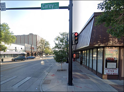 This wasn’t too hard to find; look for a downtown corner with a rounded building, and big midblock structure. That was a Penneys, back when the store was a downtown staple. Along with Woolworth’s, of course. If you go down the block, you’ll see the building with the circular arches, one of those regrettable 60s inventions to “revitalize” downtown.