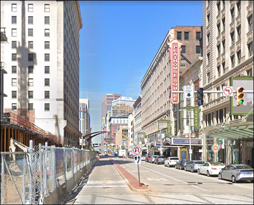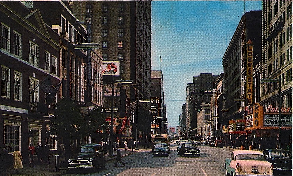 Euclid. Playhouse Square. That's the Palace Theater on the right with the RKO sign. Loew's State is now the State - both were renovated, I understand. Dig that pink Chevy!