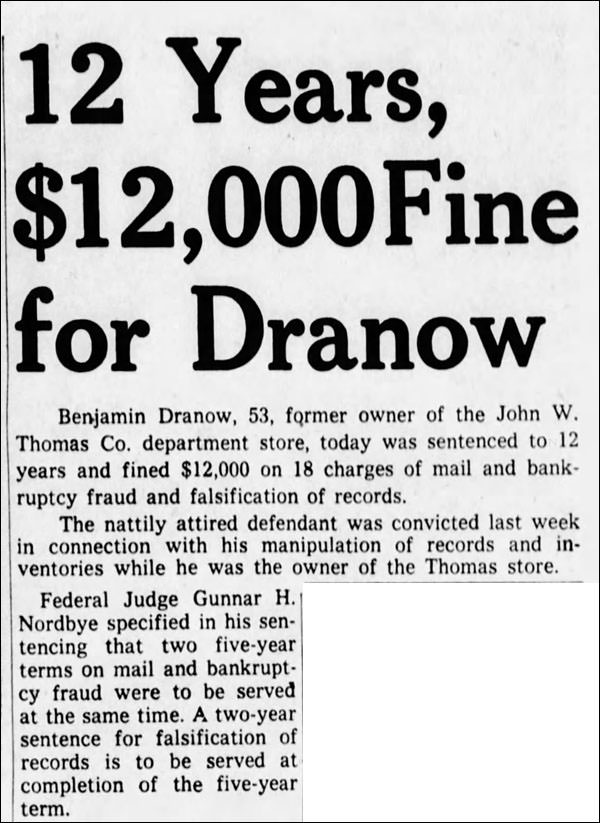 In 1956 Dranow acquired all of the outstanding stock of the firm. Financial irregularities involving Dranow are outlined in a 1958 report to John W. Thomas & Co. creditors, and Dranow was eventually convicted of mail fraud (1961) and of tax evasion/income tax fraud (1962) and sentenced to prison. The company was in bankruptcy by 1959, when Stanley D. Smith, president of Gift House Stamps, was brought in as president to try to resuscitate it. Smith was apparently successful. It is unclear what became of John W. Thomas & Co., but the firm last appears in the 1964/1965 Minneapolis city directory.