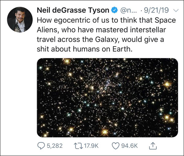 He’d also be the first to think he should be called if Aliens did arrive, because perhaps he could intercede on our behalf and explain our deficiencies - with the appropriate scientific indulgence and condescension, of course.
