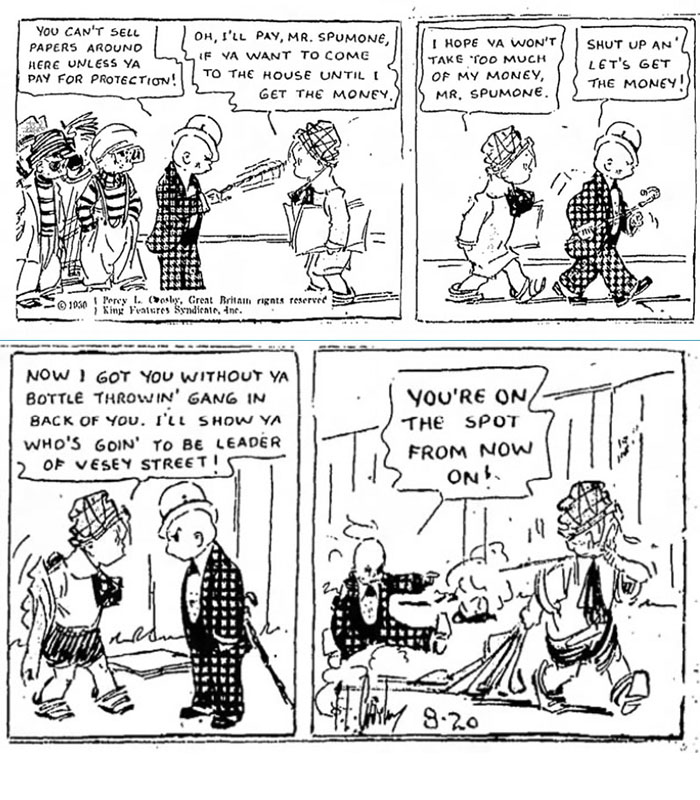 The occasional diatribes in the Skippy strip became more frequent, more surreal. Some days were almost solid dialogue. In the past, Crosby had been able to move from one discipline to another—painting, writing, cartooning, and politics. Now, under extreme mental stress, the boundaries became blurred, and one intruded into the other to the detriment of all. … [A]fter long negotiations, Crosby and King Features were unable to agree on a new contract. On December 8, 1945, Crosby's fifty-fourth birthday, Skippy, aged twenty, died.
