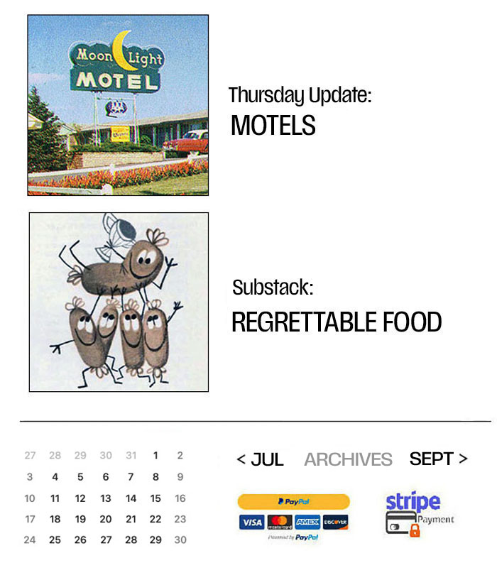 That will do for today, except of course for the motels. I can't fix Thursday comments. Don't know why. If it doesn't work for you, try this.