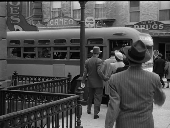 So. We’re in the City, and after some stock footage we board the bus in the backlot . . .