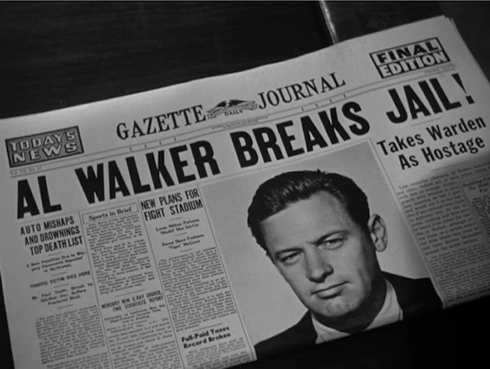 Basically, it’s “Petrified Forest” larded with lazy Freudianism. See, William Holden is a psycho killer who busted out of stir, and can be easily identified by the ear-shaped thing glued to his head: