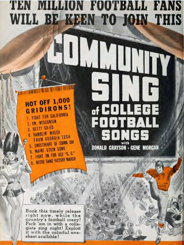 A concept no longer in vogue: everyone goes to the movie theater and sings along! Perfect for a season when the nation is both college- and football-mad.