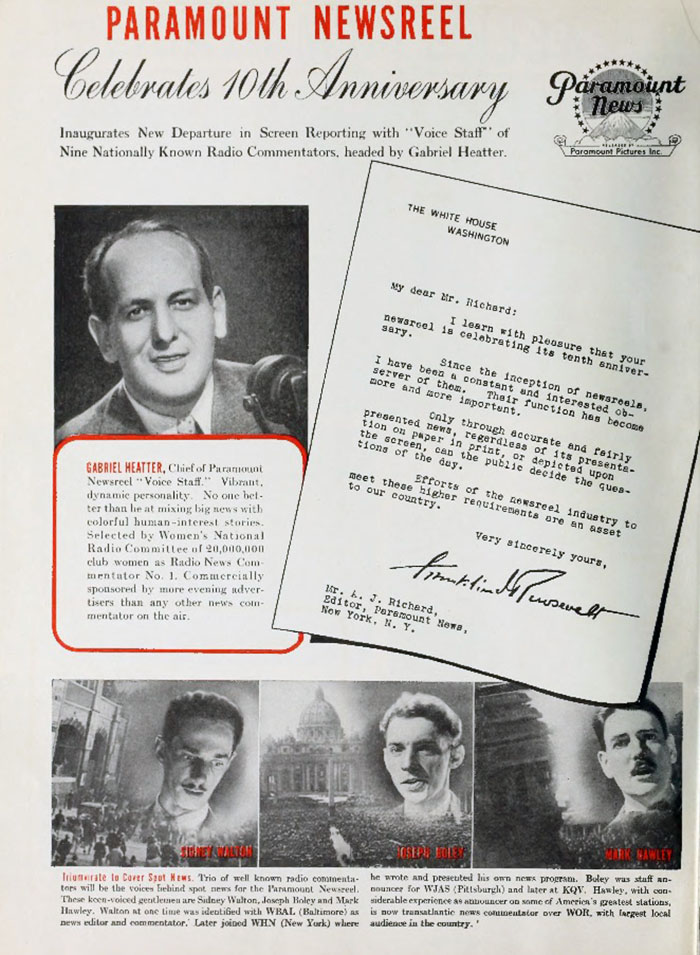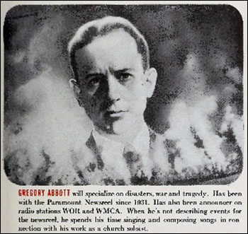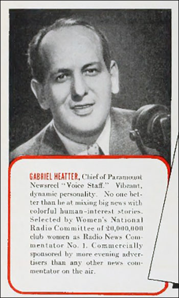 Gabe: “Gabriel Heatter (September 17, 1890 – March 30, 1972) was an American radio commentator whose World War II-era sign-on, "There's good news tonight," became both his catchphrase and his caricature.” So: “the critic and sometime rival Alexander Woollcott composed the doggerel couplet: ‘Disaster has no cheerier greeter/than gleeful, gloating Gabriel Heatter.’” | |
