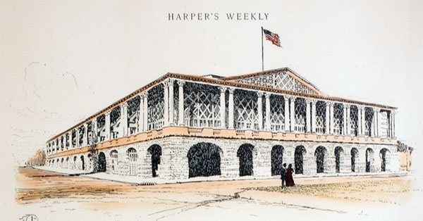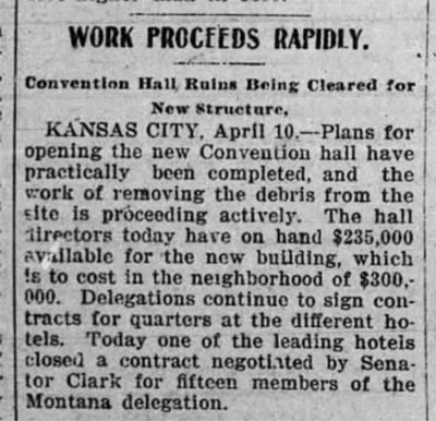 Oops: “The original Convention Hall was designed by Frederick E. Hill, and opened on February 22, 1899. This center was destroyed by a fire on April 4th, 1900. The center was redesigned by Hill, and re-opened within a 90 days after construction began.”
