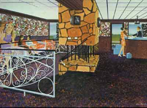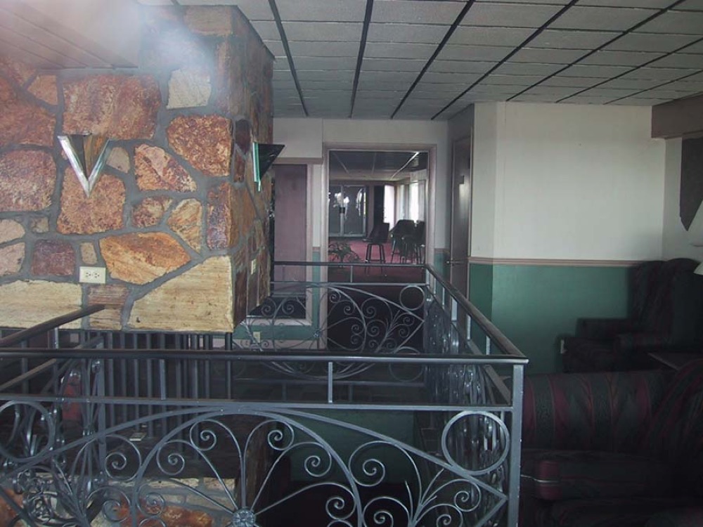Wow. The ceiling is intact. The railings, the gawdawful railings, are still around, and so is the strange non-fire fireplace. The light fixtures are different. And now we have a clue about the mysterious white things stuck in the rocky column: power outlets.