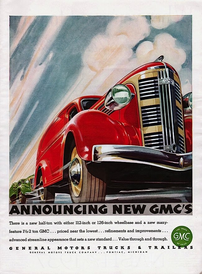 WELL HELL YES. Even the clouds are forming streamlined boxing gloves to celebrate the new GMCs. And it's nice they gave us the view you'd see when you were on the side of the road, dazed, having been struck by a car as you stood out there with your thumb out, tryin' to get a ride to a city where there might be a job for a fella. |
