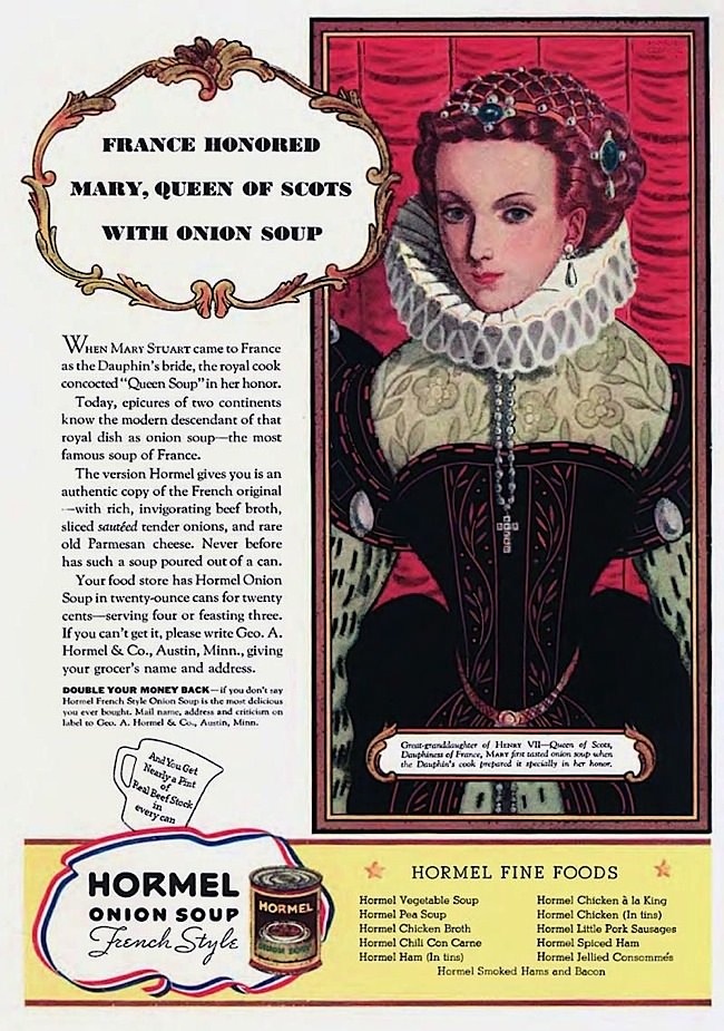 Ah, here we see why Hormel is in the “onion soup” game - beef stock! Toss Bossie-parts into the grinder, add water, strain, and you have a new product. But how to convince people this humble substance is a delicacy, a treat previously known only to the high-hat crowd who strike waiters with their canes if the soup is served after it’s begun to cool? Enlist doomed royalty.