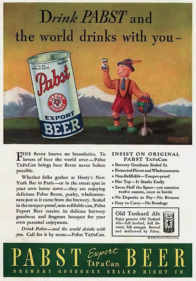 The idea of Pabst as a world ideal may amuse modern folk, but I suppose a technological innovation like this - the flat-topped can, keeping the golden richness pure for months - would naturally be seen as a boon to the ever-shrinking, cosmopolitan world. You could pop open a can in Topeka and think "I bet the swells are drinking this on liners and zeppelins, right now." |