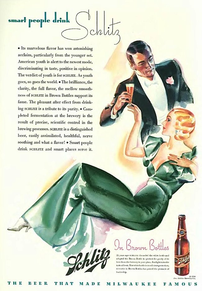 The brown bottle is somehow declasse now - it's so pedestrian, so ordinary, so louche. Don't you want to see the color of the beer? But as the small printed noted, sunlight ruins beer, so Schlitz "discarded the white bottle."