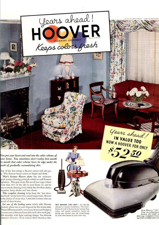 The copy says "you put your heart and soul into the color scheme of your home," hence the need to keep it from being covered in grime and dust. The photo is a reminder that the 30s were not necessarily streamlined and monochromatic. This was the goal; this was the dream. |