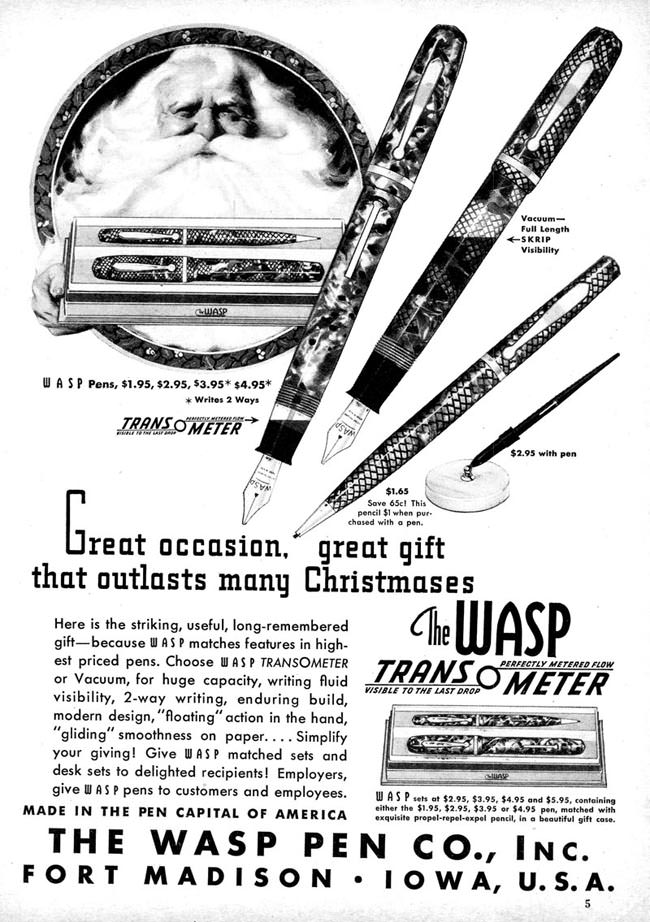 WASP stood for "William A. Sheaffer Pen." It was a division of Shaeffer, but as you can tell it didn't boast the fact. The ad does mention Skrip ink, though; that was a Sheaffer product. Smart people could make the connection.