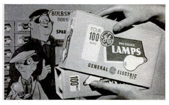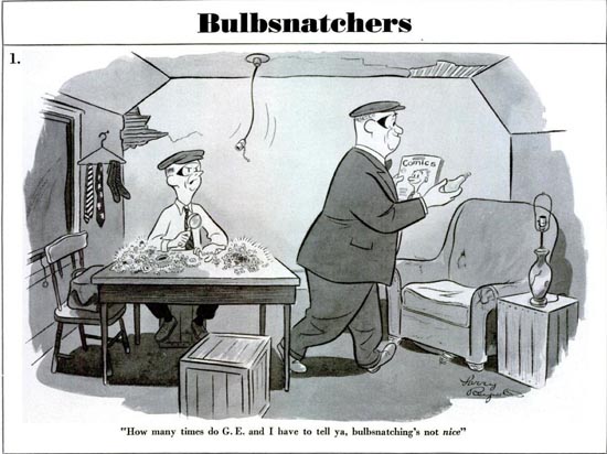The Bulbsnatchers. The struggle against Bulbsnatching had raged for years, and each manufacturer had its own spin. The problem: people took a bulb from a lamp to replace a dead one. Why? Because they were too damn lazy to go to the cupboard for a fresh bulb, or too cheap to buy one. These ads made an association between bulb-repositioning and minor, harmlessly comic criminality.