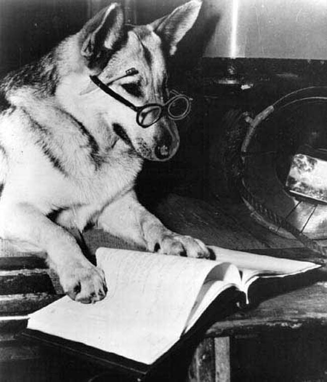 After the obligatory contract-signing photo, it’s time for the equally obligatory script-reading photo. Here we see Rin Tin Tin Tin etc. examining the story, complete with a pencil so he can make notes. This picture was dragged out and reprinted whenever Rinty made another movie, or had his TV show renewed.
