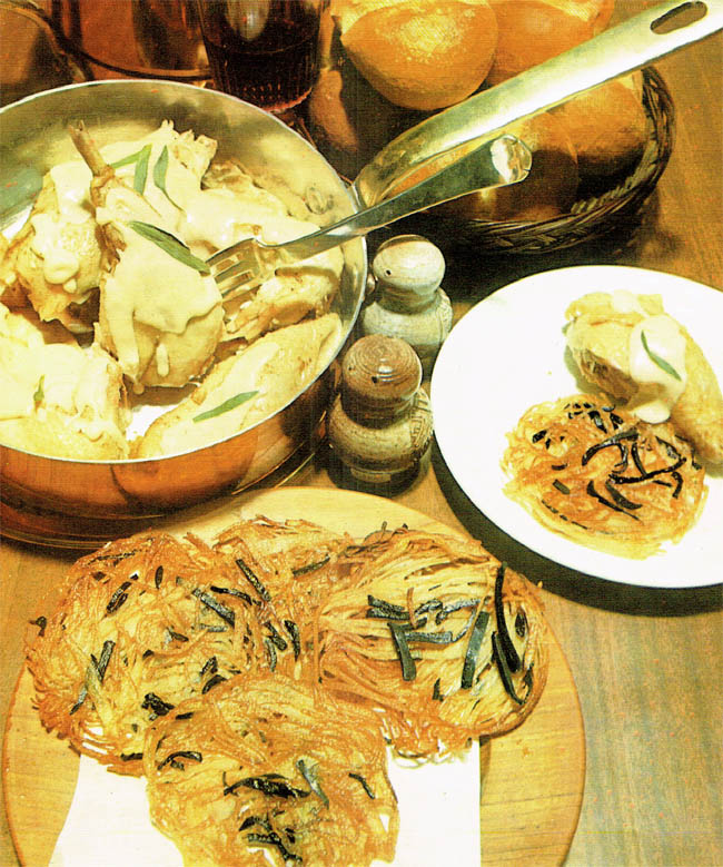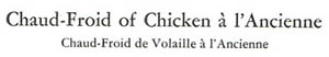 Ancient Chicken? Well, resourceful cooks can do wonders with even the most elderly of birds. It's fricassed chicken, basically, with the addition of chaud-froid, or, as the Germans called it, "typically effete French nonsense that got in the way of the meat." The circular things are the chaud-froid, I presume, but is it fried creamy meat-Jell-O or hashed browns infused with chaud-froid? Unless the chaud-froid is the goop on the chicken, or goup de poullet.