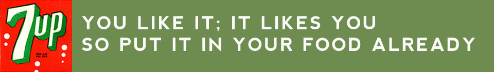 Again with the purity and goodness and wholesomeness – it’s almost as if they protest too much. No, it was Six-Up that was caught in that reefer scandal. This is Seven-Up! The fact that all ages like it gets mentioned twice, and the name of the product is spelled in two different ways. Quote marks around “goes great.” The slogan, chopped in two and dropped in at random. No period at the end of the first paragraph.