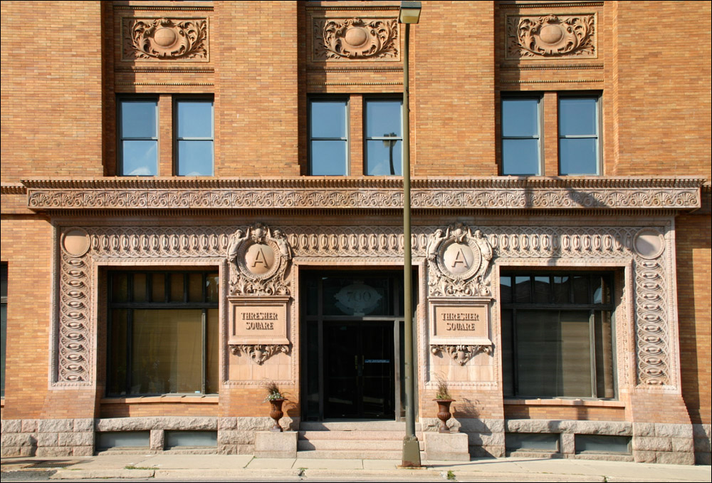 It has two entrances. This one proclaims the glory of A! Vitamin, vowel, and first letter in Advance. Great name for a company; forward and excelsior, and all that. Next: close-ups of the carvings.