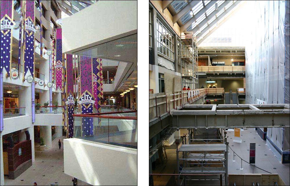 The interior food and shopping court. On the left: back when they were trying to convince people it was a fun, exciting place to be. On the right: they gave up and stripped it down and turned most of the retail into office. The food court - once the biggest downtown, with everything from fast food to a video-game arcade - was walled off.