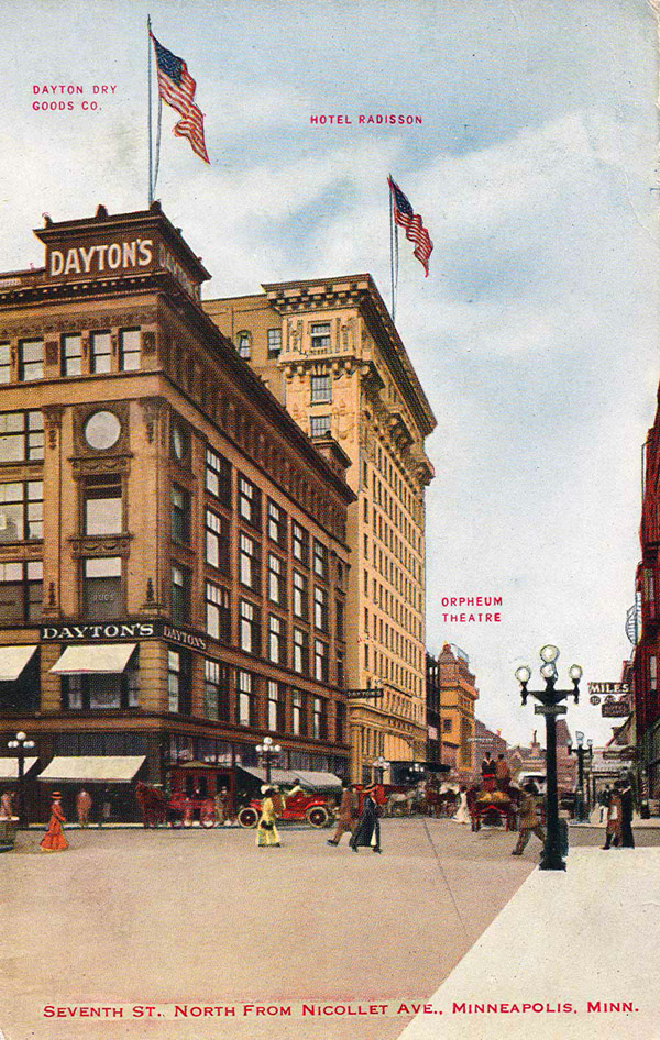 The Orpheum in the picture is not the Orpheum of today; they tore it down and built a new one on Hennepin. Everything in this picture is gone except Dayton’s, although at least Radisson had the decency to put up another Radisson on the site.